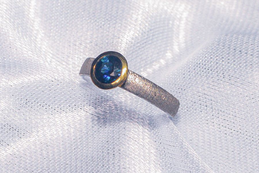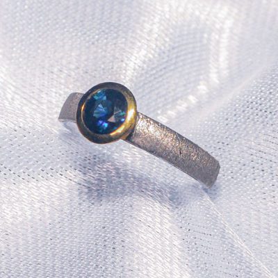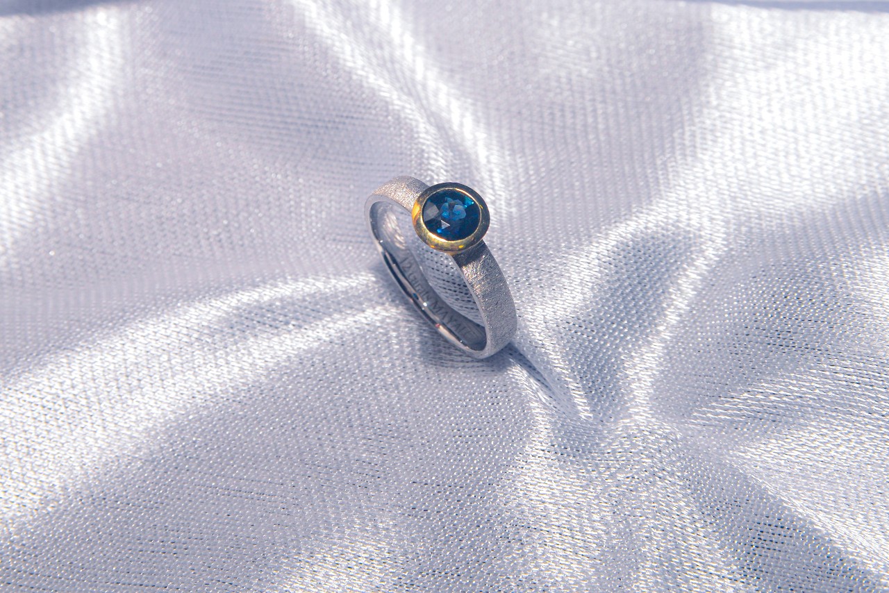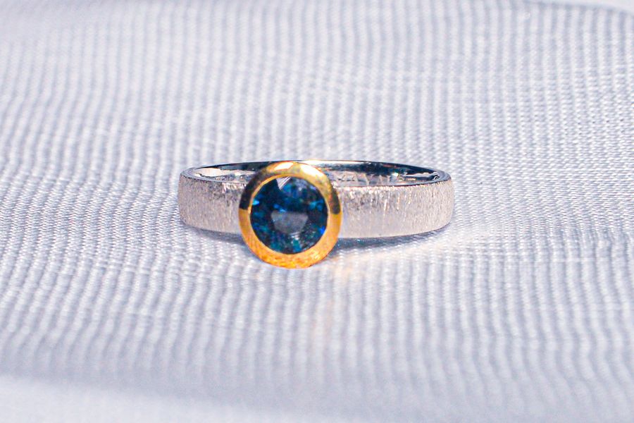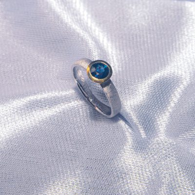 Au centre, un saphir bleu naturel de 0,6 carat, à l’éclat profond et apaisant, serti dans un délicat entourage doré qui vient souligner la pierre sans jamais l’enfermer.